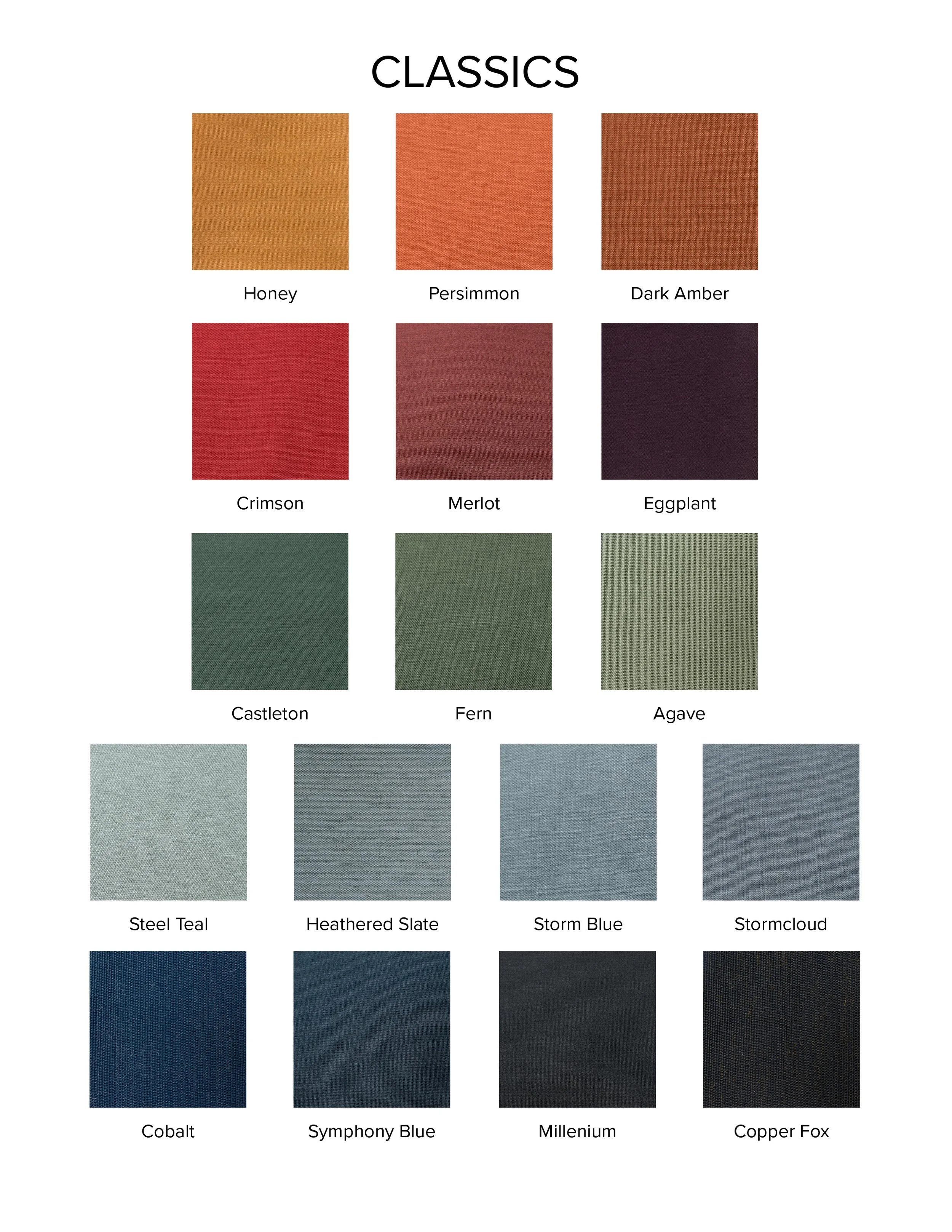 Choose two of our fine fabrics available in a selection of beautiful colors, one for the outside of the box, and one for the inside walls. Colors below.