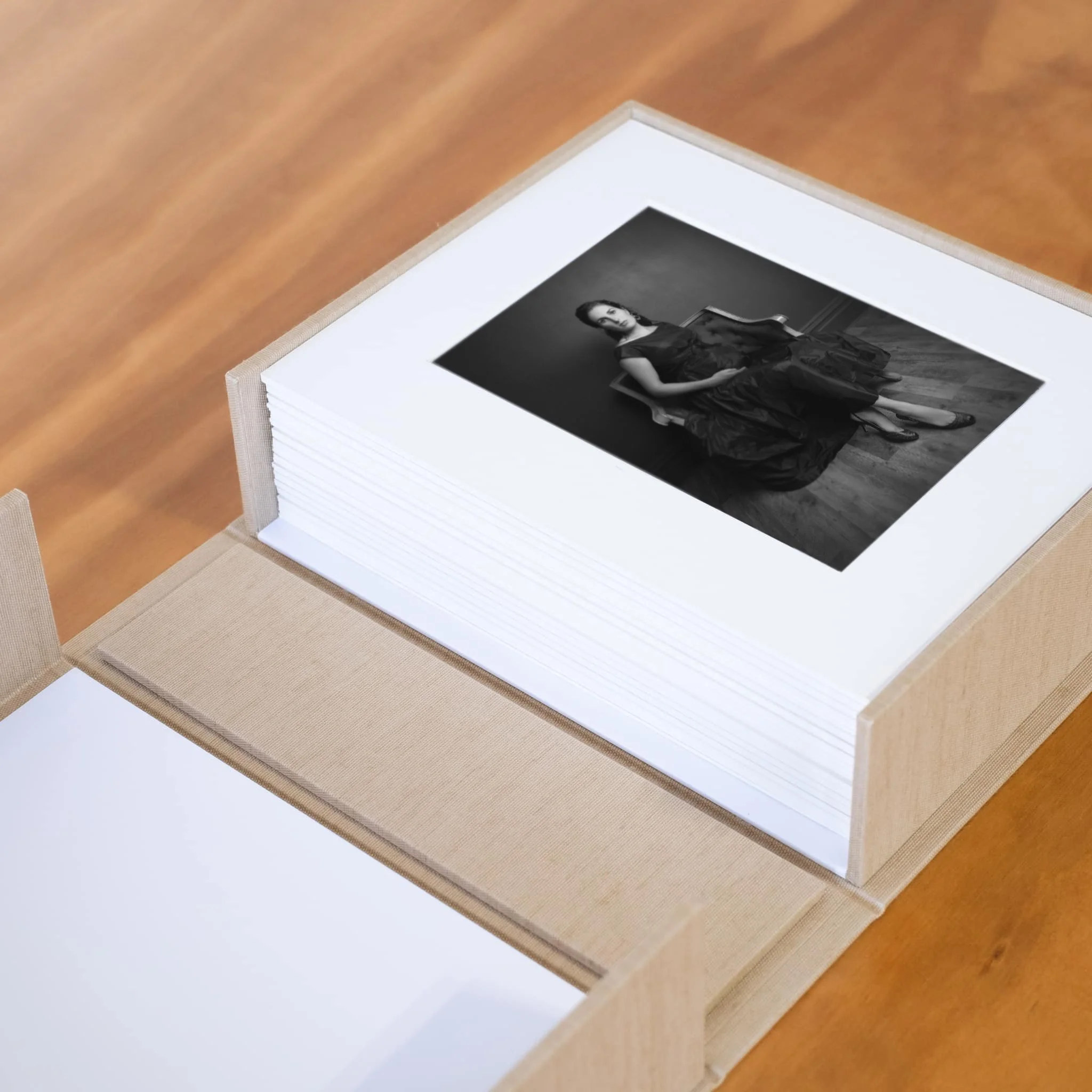 Our archival Fine Art Portrait Box Collections include an exquisite hand-made heirloom case, covered in fine silks or linens, filled with beautiful matted fine art prints.